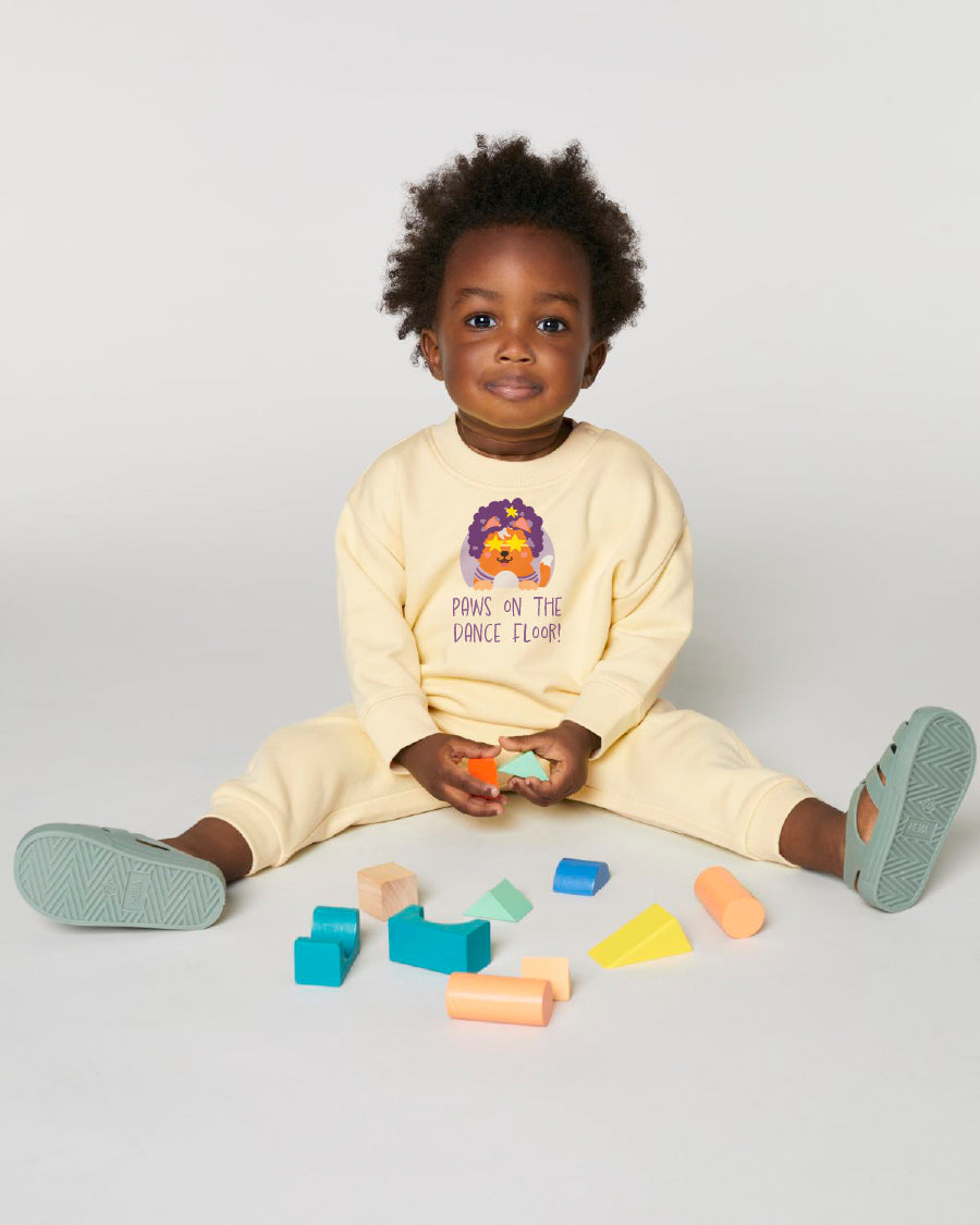 🪩 Pootjes de lucht in – het is disco time met Wuppy! In deze funky baby sweater met de tekst “Paws on the dance floor!” steelt jouw kleintje gegarandeerd de show 💃🐾😺. Gemaakt van een zachte, gewassen mix van 85% biologisch katoen en 15% gerecycled polyester (280 g/m²), is deze sweater heerlijk warm en comfortabel voor elk dansmoment.